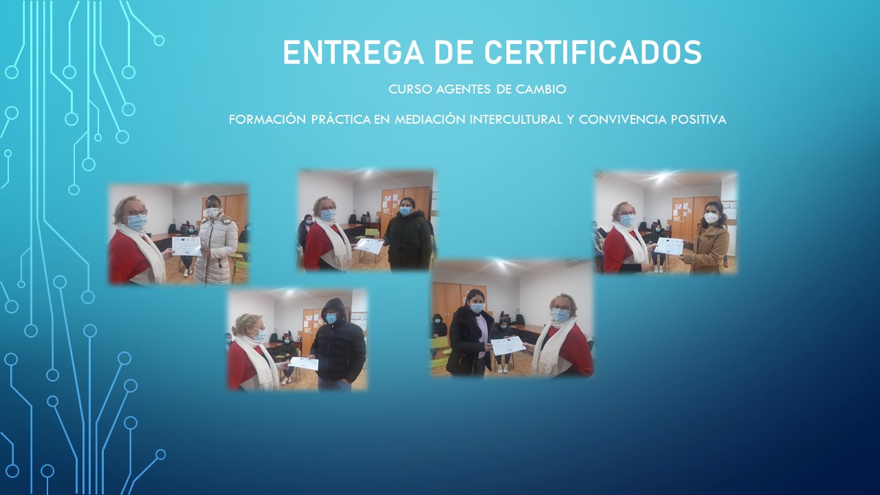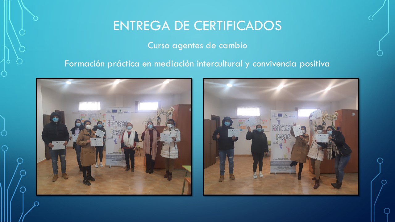 La semana pasada, la presidenta de a Asociación Mundo Acoge, Ana Fiñana Hidalgo, ha hecho entrega de los certificados a las/os alumnas/os del curso Agentes de Cambio. Queremos dar la enhorabuena por el esfuerzo y el trabajo realizado a todos/as los alumnos/as.